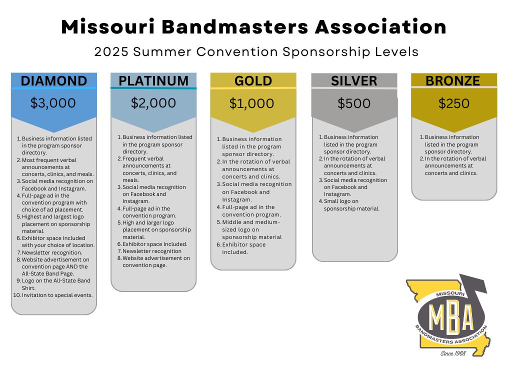 Convention Exhibitor/Sponsorship MBA SUMMER CONVENTION June 14-17, 2026 Tan-Tar-A Conference Center Osage Beach, Missouri "*" indicates required fields X/TwitterThis field is for validation purposes and should be left unchanged.Business/Sponsor InformationName of Business*Business Address* Street Address City State / Province / Region ZIP / Postal Code Company Website Company Representative* First Last Representative Email* Representative Phone* Sponsorship Diamond Sponsor ($3,000) Platinum Sponsor ($2,000) Gold Sponsor ($1,000) Silver Sponsor ($500) Bronze Sponsor ($250) We do not wish to select a sponsorship at this time. Exhibit Space Information Gold, Platinum and Diamond Sponsorship Levels include a complimentary exhibit table with sponsorship. If you need additional tables or if you will be exhibiting only, please select your table needs below.Exhibitor 1 Table ($225) 2 Tables ($315) 3 Tables ($390) 4 Tables ($450) SUSTAINING MEMBER ONLY, NO TABLES ($150) Gold, Platinum or Diamond Sponsor (Table Included) Electricity Add Electricity ($55) We will not need electricity Do you have a tabletop display over 3 ½ feet? Yes No Do you have floor banner/s or a backdrop over 6 ½ feet? Yes No MBA Golf Tournament Sponsorship Options Golf Tournament Sponsors $500 MBA Golf Tournament Sponsor (1 available) $100 MBA Golf Tournament Hole Sponsor (18 available) $50 Give Away/Drawing Items (Golf Balls, Towel, etc) Total Payment Option*Please select an option and click "Submit." Continue To Payment by Credit Card Submit Information: Request Payment by Check Credit Card MasterCardVisaSupported Credit Cards: MasterCard, Visa Card Number Expiration Date Month Month010203040506070809101112 Year Year20252026202720282029203020312032203320342035203620372038203920402041204220432044 Security Code Cardholder Name Questions? Contact the following: Exhibitor/Sustaining Member Registration: Steve Litwiller (Exhibitor Chair) slitwill1956@gmail.com Sponsorship Only: Kurt Bauche (Secretary/Treasurer): kdbauche76@yahoo.comCAPTCHA